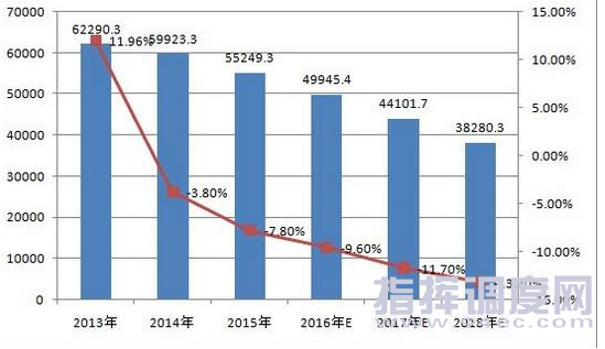 2013-2018年中国模拟标清视频监控摄像机市场总量及增长率预测(单位:千台)