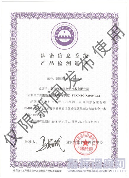 2017年,北京飞利信电子技术有限公司的御智信防火墙FLX/NSG-X1000系列产品凭借标准的安全设计、丰富的应用功能、高效的传输性能、稳定的操作系统一次性通过了公安部信息安全产品检测中心的产品鉴定,取得了公安部安全产品销售许可证。2018年,御智信防火墙又获得国家保密科技测评中心检测认证,取得涉密信息系统产品资质。御智信防火墙成功通过数项严密的安全性能测试。能够通过高标准高级别的验证,意味着御智信防火墙获准进入市场销售,可为更多领域的客户提供信息安全服务。